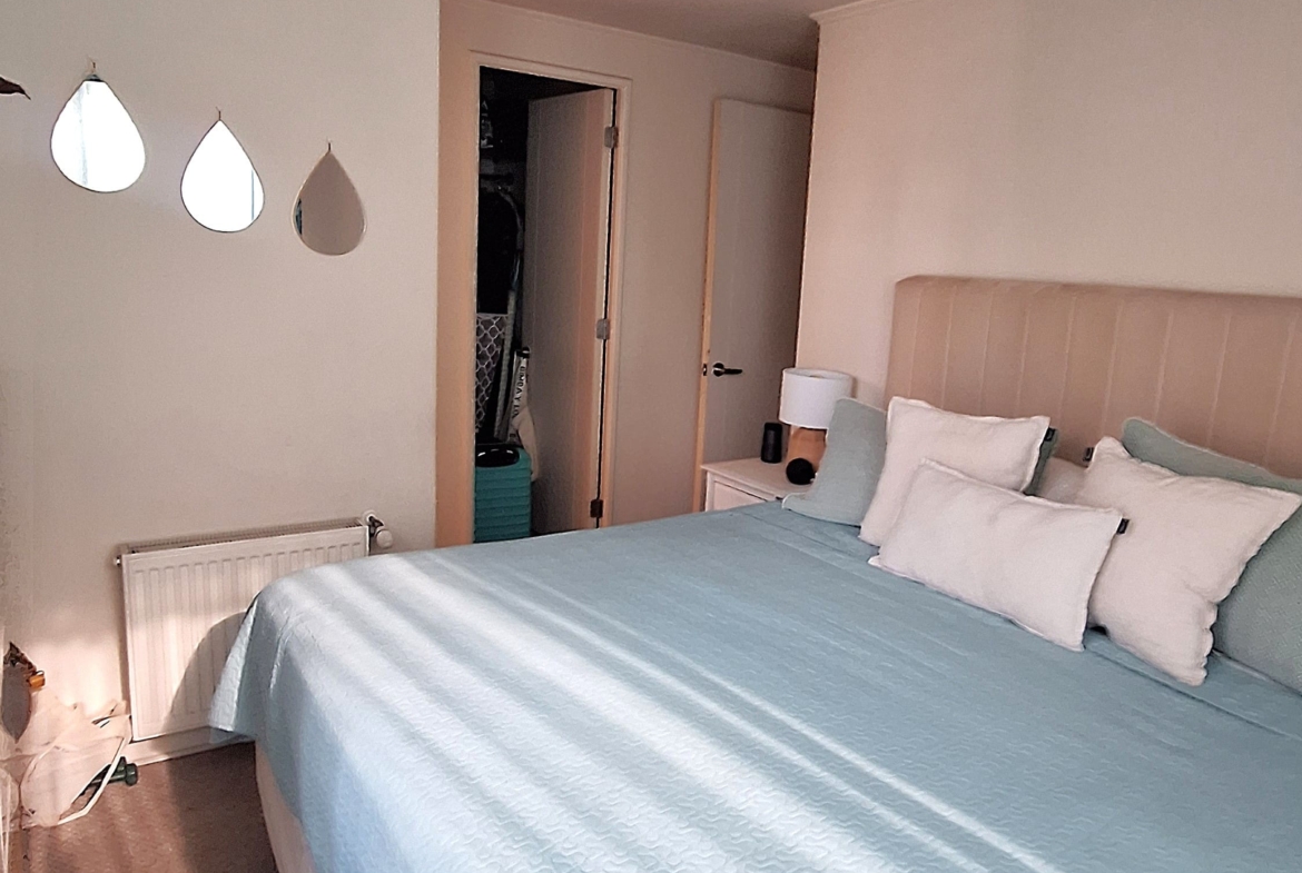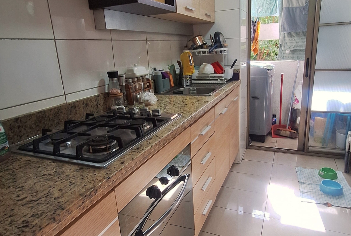 Este departamento de orientación nor-poniente, se encuentra en un segundo piso, rodeado de áreas verdes y espacios comunes que ofrecen un entorno armónico y agradable. Con una superficie total de 74 m² y útil de 69 m², dispone de hall de acceso, hall de distribución, dos dormitorios, uno en suite y dos baños, proporcionando funcionalidad y comodidad. El living y comedor se presentan como ambientes independientes, con acceso a una terraza que permite disfrutar del exterior. La cocina está equipada con encimera, horno y campana y cuenta con una cómoda logia cerrada con conexión a lavadora.